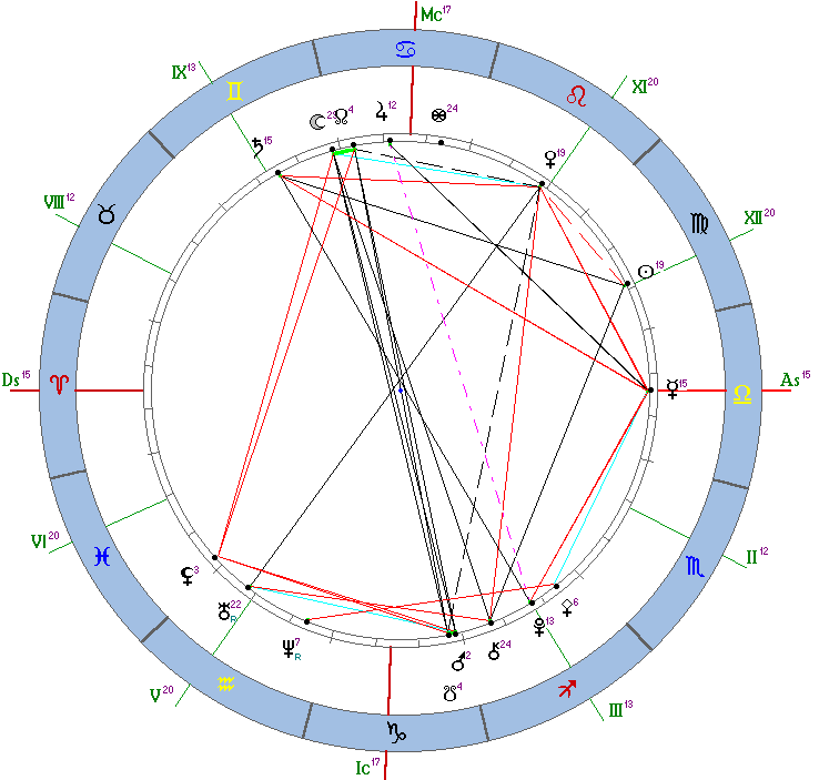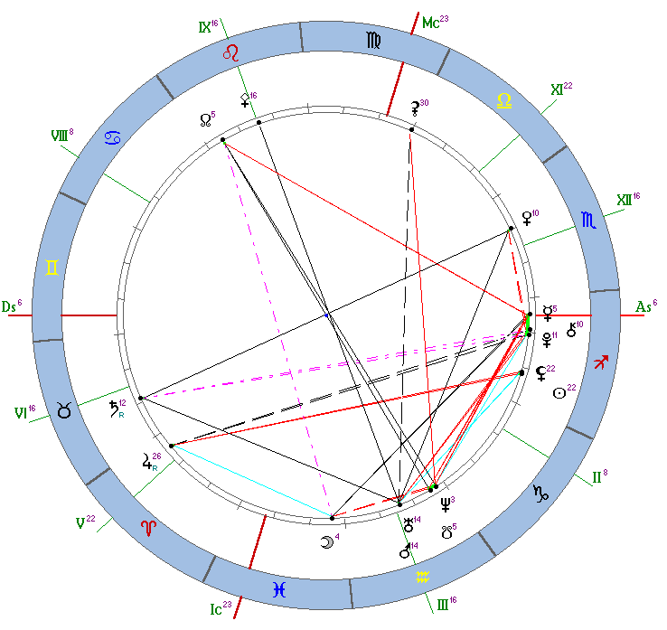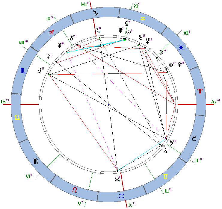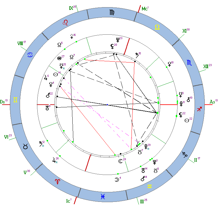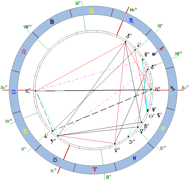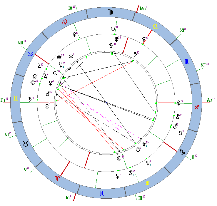 Рис. 8. Гороскоп на момент атаки первого самолета, 11.09.2001 8:45 Нью-Йорк, система домов Топоцентрическая.