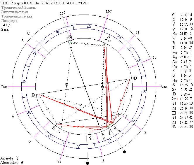 Тогда это больше вяжется с пастухами, "которые содержали ночную стражу у стада своего", что для климата Израиля вполне реально в это время. Но, если мы посмотрим натальную карту, ТО УВИДИМ, что кроме Солнца, Юпитера, Сатурна, туда подошли Венера и Луна с Ураном, и 2 марта в 3 часа по местному времени они выстроились в три пары, олицетворяя звезду Давида, от которого вёл свой род Спаситель. Когда это было сделано, к моему удивлению, еще одна планета -- Меркурий дополнила картину, став в Водолее (древнее название -- Пастух, Погонщик верблюдов), соединившись со священной звездой Востока -- Ахернар (альфа Эридана), ещё одно её название -- Ангел. Тот самый Ангел, оповестивший пастухов о рождении Мессии.