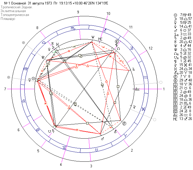 Я думаю, возникнет вопрос: "как это поставить "зеркальную луну" в градус? А что же будет с Солнцем? А ничего! Просто постройте гороскоп с установкой Луны в нужный вам градус, а куда в этом гороскопе станет Солнце, уже не имеет значения. Для вас главное -- лунар от этого гороскопа. Не трудно догадаться, что в году у здоровой женщины, если не было удаления одной из труб, может быть около 26 зачатий. Правильно! Но, это ещё не говорит о том, что будет 26 рождений, просто степень риска попасть на аборт возрастает. А не проще ли знать эти даты и обезопасить себя от проблем! А для полного восприятия, я хочу вам предложить реальный гороскоп моей пациентки в качестве примера.