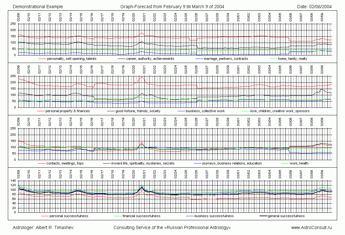Graph-forecast indicates the hourly level of one's successfulness in conventional scale for twelve spheres of life and three directions ('personality,' 'finance/substance,' 'business/information'). The 'general successfulness' is the average of all twelve spheres.
