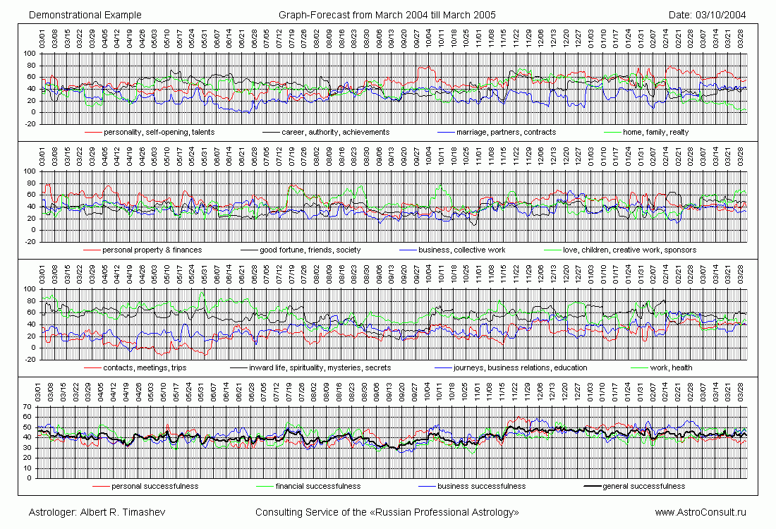 Graph-forecast indicates the daily level of one's successfulness in conventional scale for twelve spheres of life and three directions ('personality,' 'finance/substance,' 'business/information'). The 'general successfulness' is the average of all twelve spheres.