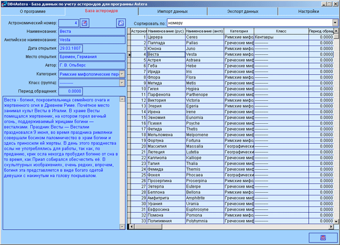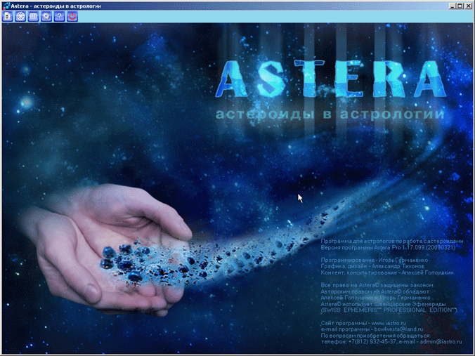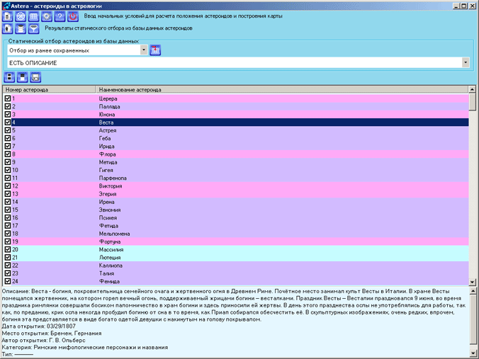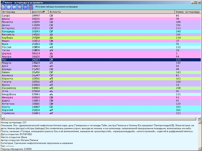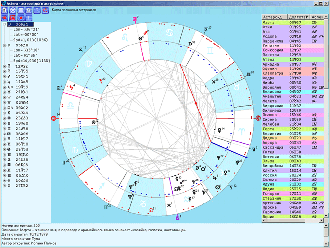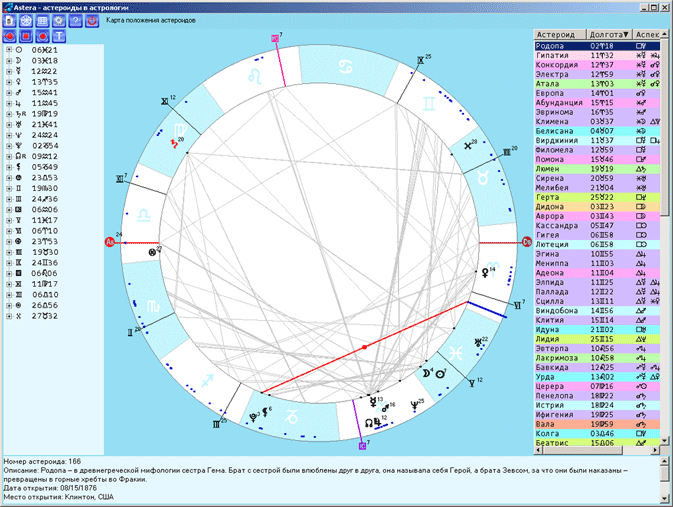 Программа Astera предоставляет современному астрологу инструмент для практической и исследовательской работы с астероидами, как астрологическими объектами.