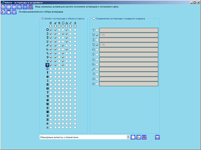 На этом экране пользователь может по своему усмотрению задать условия для отбора астероидов по аспектам к объектам карты или попадания этих астероидов в заданные градусы Зодиака.