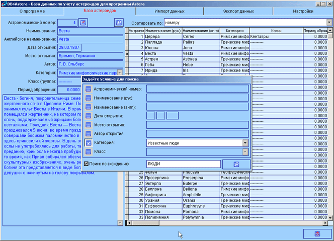 расширенный поиск астероидов по базе данных с использованием всех возможных признаков (номер, наименование, категория и т.д.)