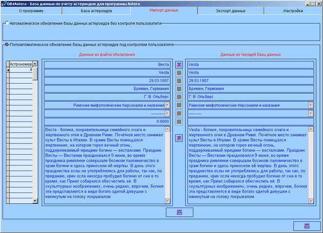 При импорте новых или обновленных данных об астероидах предлагается автоматический или полуавтоматический (под контролем пользователя) режим подгрузки данных в базу.