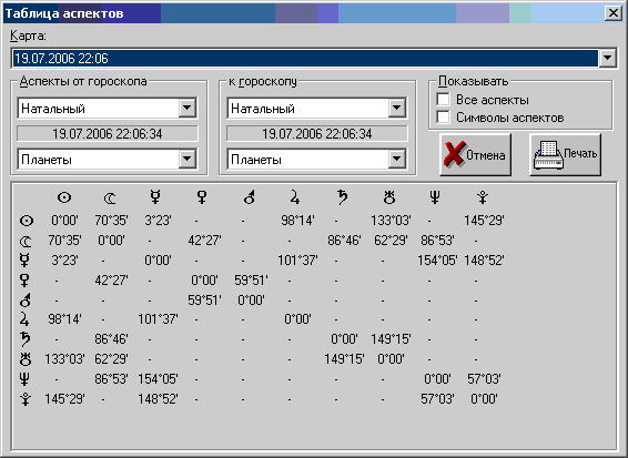 Окно таблицы аспектов. Позволяет отображать как аспекты внутри карты, так и кросс-аспекты между объектами карты. При необходимости можно задать отображение аспектов значками либо в градусной мере.