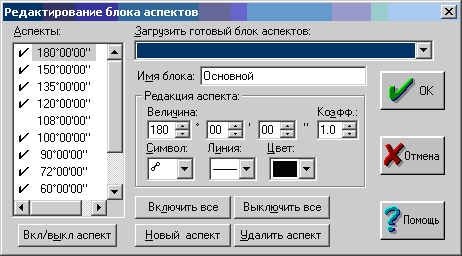 Окно "Редактирование блока аспектов" предназначено для создания новых блоков аспектов и редактирования уже существующих. Пользователю предоставлена возможность создавать практические любые угловые аспекты и управлять их отображением на картах.