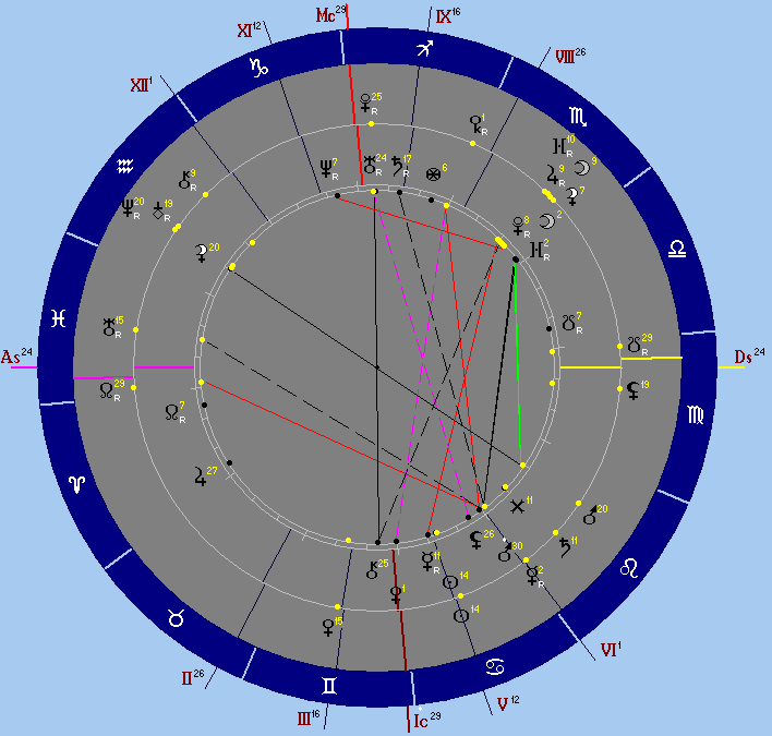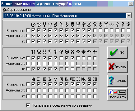Кросс-карта. При работе с двойными картами программа позволяет строить аспекты от(на) объекты и кросс-аспекты от(на) указанные объекты обоих карт. Богатый набор инструментов управления отображением делает работу с картой быстрой и комфортной