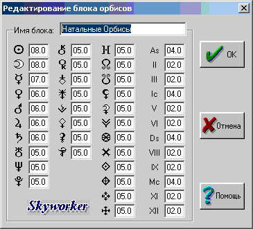 Окно "Редактирование блока орбисов" предназначено для задания орбисов объектам карты. Наборы орисов можно сохранить и выбирать в процессе работы с различными видами карт.