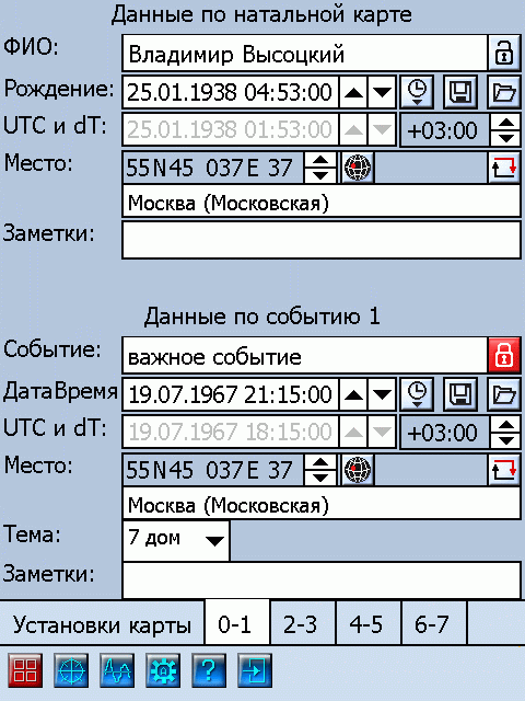 С этой страницы выполняется ввод необходимых данных (наименования события, даты-времени, координат места и временной поправки) для построения астрологических карт.