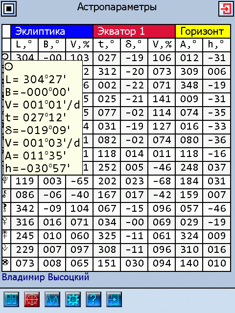 В программе легко получить справочные данные по астрономическим параметрам небесных объектов в 3-х системах координат. Нажатием пера на заголовок или ячейку можно получить более точную информацию по нужному объекту.