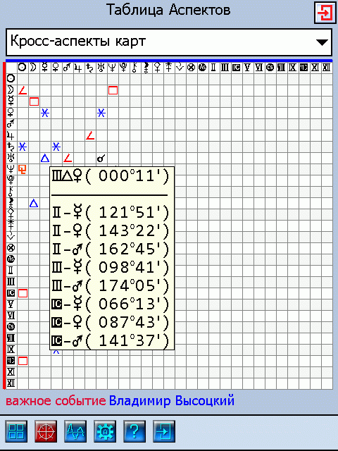 В таблице можно получить информацию по аспектам внутри карты (внутренней или внешней) и между картами (кросс-аспекты). Информацию можно получить как в величинах аспектов, так и в градусной мере. Дополнительно можно получить информацию о точности действующего аспекта.