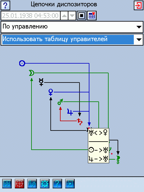Модуль строит цепочки диспозиторов по управлению, экзальтации, изгнанию и падению для объектов карты. Модуль определяет начальные и конечные диспозиторы, взаимные рецепции, а также обособленные объекты карты. Графическая информация содержит дополнительный слой для анализа - стихии объектов.